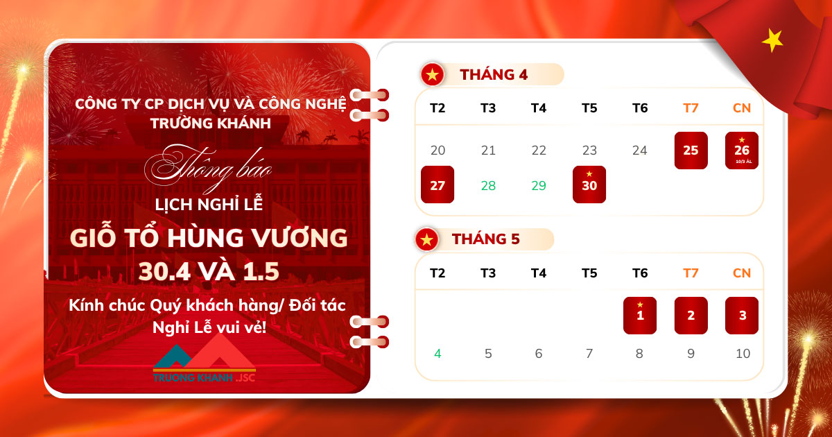 Công ty Cổ phần Dịch vụ và Công nghệ Trường Khánh xin trân trọng thông báo đến Quý Khách hàng và Đối tác lịch nghỉ Lễ Giải phóng miền Nam (30/4) và Quốc tế Lao động (1/5) năm 2026 như sau:
